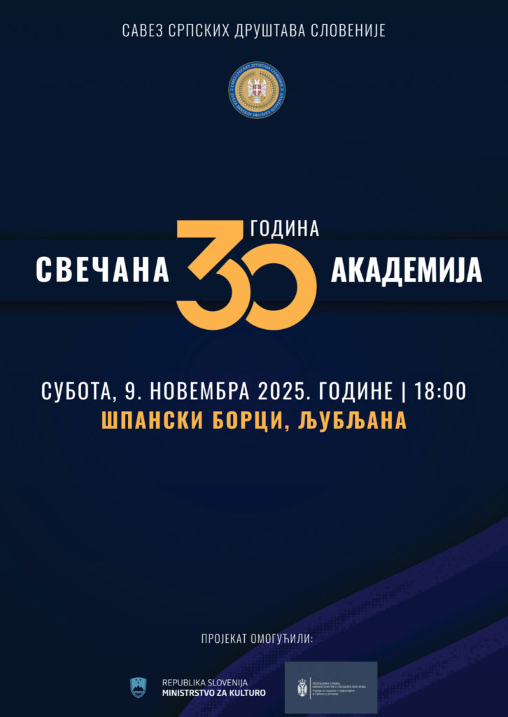 SAVEZ SRPSKIH DRUŠTAVA SLOVENIJE Ivo Vojvodić – novi ambasador Republike Srbije u Sloveniji primio predstavnike Saveza srpskih društava Slovenije Pročitaj više NOVO Predstojeći događaji Aktuelno Najnovije informacije i dešavanja u savezu. Učešće Saveza srpskih društava Slovenije na tribini „Istinom za Srbiju“July 29, 2025U organizaciji Ambasade Republike Srbije u Sloveniji, Savez srpskih društava Slovenije aktivno je učestvovao na… Novi veb sajtJanuary 28, 2025Savez srpskih društava Slovenije započeo godinu sa osveženjem – novi veb sajt zajednice Savez srpskih… Ivo Vojvodić – novi ambasador Republike Srbije u Sloveniji primio predstavnike Saveza srpskih društava SlovenijeSeptember 19, 2025Dana 18. septembra 2025. godine, Njegova ekselencija gospodin ambasador Ivo Vojvodić primio je u prostorijama… 12 Savez čine Društava 0 Članova 0 + Upoznaj društva